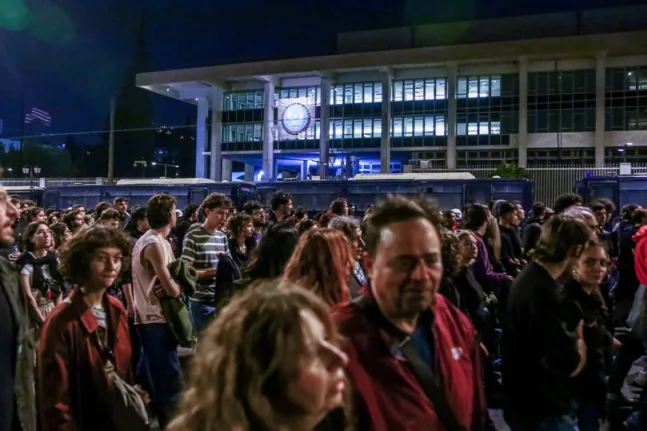 -Η κεφαλή της πορείας είχε φτάσει στην πρεσβεία, περίπου στις 6.30 το απόγευμα. Νωρίτερα, είχε φτάσει το μπλοκ των φοιτητών με την αιματοβαμμένη σημαία του Μετσοβίου