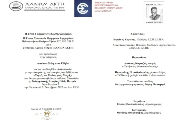 Η Στέγη Γραμμάτων «Κωστής Παλαμάς», η Ένωση Συντακτών Ημερησίων Εφημερίδων Πελοποννήσου-Ηπείρου-Νήσων (Ε.Σ.Η.Ε.Π.Η.Ν.) και ο Σύνδεσμος Αχαΐας-Κύπρου «ΑΧΑΙΩΝ ΑΚΤΗ» σας προσκαλούν στην εκδήλωση «Από τον Ελύτη στον Κάλβο» για τον συνθέτη Ηλία Ανδριόπουλο, με την ευκαιρία της κυκλοφορίας του βιβλίου του «Σκηνές και Εικόνες μιας Εποχής».