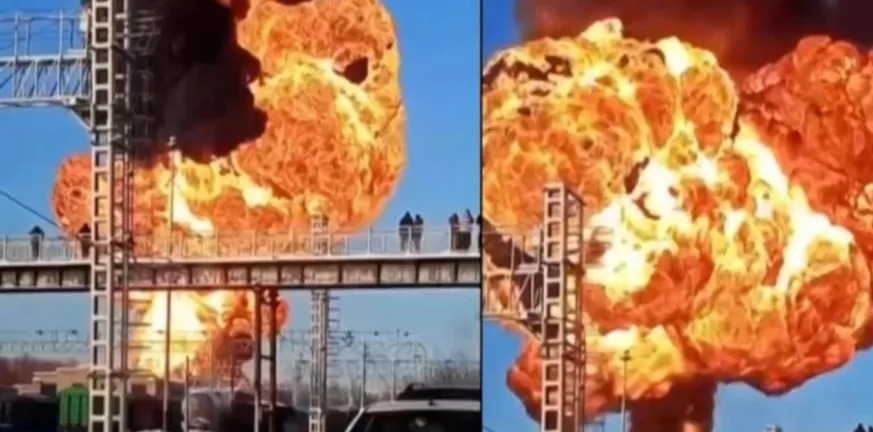 Μια πύρινη σφαίρα σε σχήμα μανιταριού υψώθηκε στον ουρανό μετά από έκρηξη βαγονιού με καύσιμα σε τρένο στην περιφέρεια Ταμπόφ της Ρωσίας, που εκτελούσε κρίσιμο δρομολόγιο μεταφοράς προμηθειών για τον πόλεμο στην Ουκρανία.