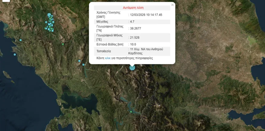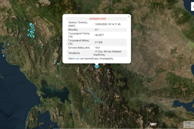 Ιδιαίτερα αισθητός έγινε ο σεισμός μεγέθους 4,8 Ρίχτερ που σημειώθηκε το μεσημέρι της Πέμπτης 12 Μαρτίου στην ευρύτερη περιοχή ανάμεσα σε Ευρυτανία και Καρδίτσα, προκαλώντας ανησυχία στους κατοίκους και κινητοποιώντας άμεσα τις τοπικές αρχές. Σύμφωνα με τις πρώτες πληροφορίες, το επίκεντρο εντοπίζεται 11 χιλιόμετρα βορειοανατολικά του Ραπτοπούλου, ενώ μέχρι στιγμής δεν έχουν αναφερθεί τραυματισμοί.