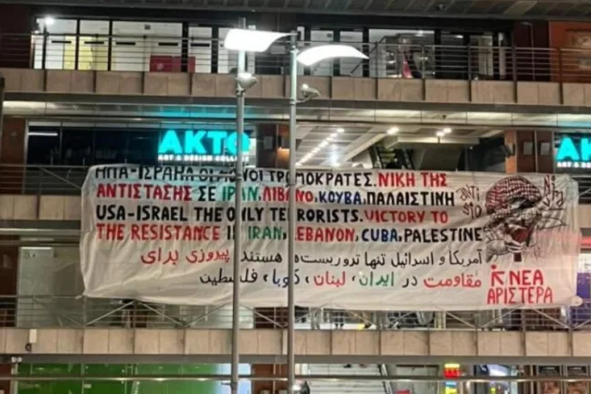 «Μέλη της Νεολαία Νέας Αριστεράς στη Θεσσαλονίκη άνοιξαν πανό απέναντι από το Αμερικανικό Προξενείο στην πόλη με αντιπολεμικό μήνυμα για τον πόλεμο Τραμπ-Νετανιάχου στο Ιράν.