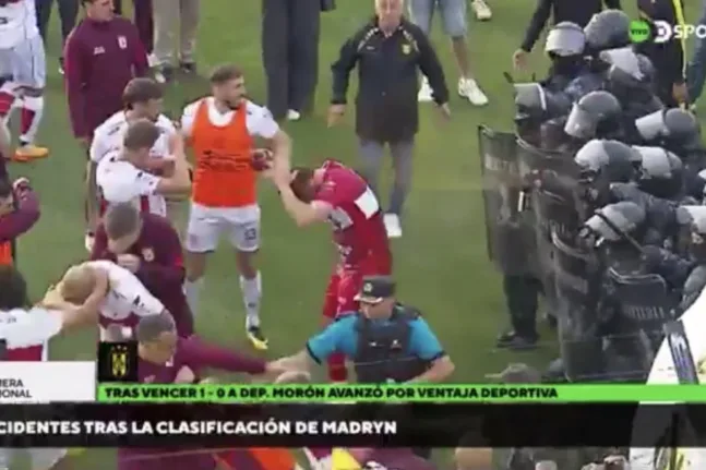 Στην Αργεντινή απίστευτα σκηνικά εκτυλίχθηκαν κατά τη διάρκεια της αναμέτρησης Deportivo Madryn – Deportivo Morón για την ημιτελική φάση των play-offs ανόδου της Β’ κατηγορίας, που εξελίχθηκε σε γενικευμένη συμπλοκή μέσα στον αγωνιστικό χώρο, αναγκάζοντας την αστυνομία να επέμβει κάνοντας χρήση χημικών.