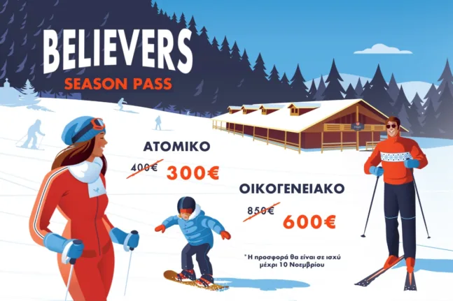 Από τις 27 Οκτωβρίου έως τις 10 Νοεμβρίου, οι λάτρεις του χιονιού μπορούν να εξασφαλίσουν τη θέση τους για τη νέα σεζόν μέσα από τη “Believers” προπώληση ετήσιων καρτών, στις προνομιακές τιμές των 300€ για ατομική κάρτα και 650€ για οικογενειακή.