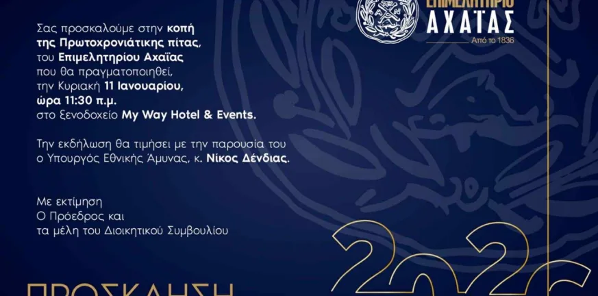 Την καθιερωμένη κοπή της Πρωτοχρονιάτικης πίτας του πραγματοποιεί το Επιμελητήριο Αχαΐας την Κυριακή 11 Ιανουαρίου 2026 και ώρα 11:30 π.μ., στο ξενοδοχείο My Way Hotel & Events, στην Πάτρα.