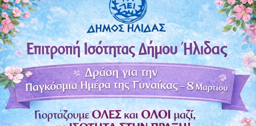 Ο Δήμος Ήλιδας και η Δημοτική Επιτροπή Ισότητας προσκαλούν όλους τους πολίτες να συμμετάσχουν σε μια πρωτότυπη και συμβολική δράση, με αφορμή την Παγκόσμια Ημέρα της Γυναίκας, στις 8/02/2026.