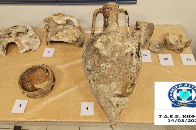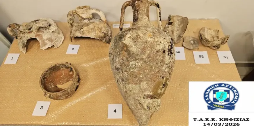 Σύμφωνα με την ΕΛΑΣ: «Από αστυνομικούς του Τμήματος Δίωξης και Εξιχνίασης Εγκλημάτων Κηφισιάς/Δ.Δ.Ε.Ε.Α./Γ.Α.Δ.Α. εντοπίστηκαν εντός οικίας 50χρονου ημεδαπού, πρωινές ώρες του Σαββάτου (14.03.2026) στην περιοχή της Κηφισιάς, 10 τμήματα ενάλιων αμφορέων.