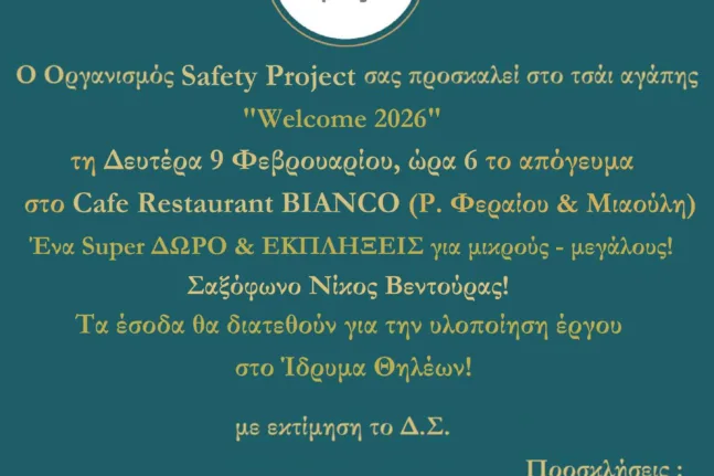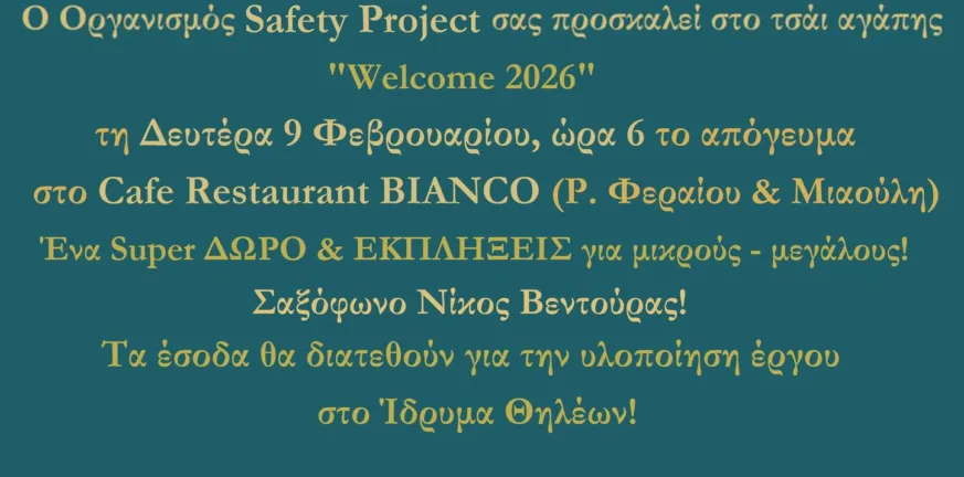 «Save the date» για τη Δευτέρα 9 Φεβρουαρίου στις 6 το απόγευμα, όταν ο Safety Project Οργανισμός προσκαλεί το κοινό σε ένα «τσάι αγάπης και προσφοράς» στο Cafe Restaurant Bianco Social Pleasure, παρουσιάζοντας το νέο του project για το 2026.