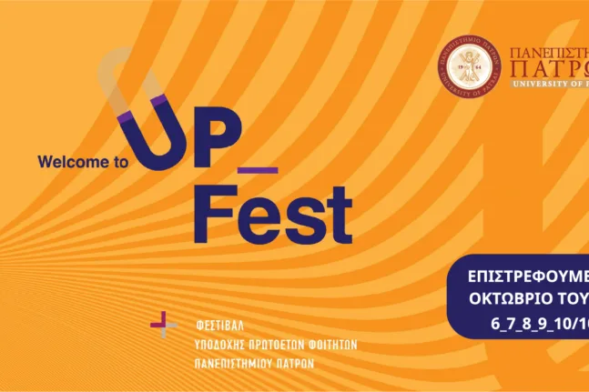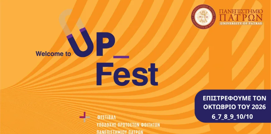 Τον Οκτώβριο του 2026 το Πανεπιστήμιο Πατρών ανοίγει και πάλι την ακαδημαϊκή χρονιά με το «Welcome to UP», το μεγάλο Φεστιβάλ Υποδοχής Πρωτοετών Φοιτητών, που θα πραγματοποιηθεί από την Τρίτη 6 έως και το Σάββατο 10 Οκτωβρίου.